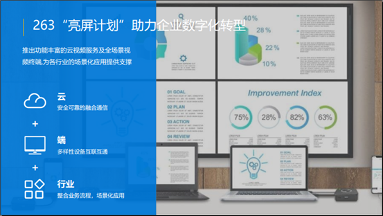 今年初,263副總裁李玉杰發布“亮屏計劃”,旨在利用“云+端+行業”解決方案幫助企業客戶連接視頻協作全場景,讓輕便易用、穩定安全的云視頻軟件提高業務協作效率,功能高度集成、兼容性強的硬件設備融入企業的辦公系統,有針對性地幫助行業客戶將協同辦公資產最高效的利用起來。目前,隨著“亮屏計劃”穩步推進,“云+端+行業”的服務模式的開始顯露優勢。