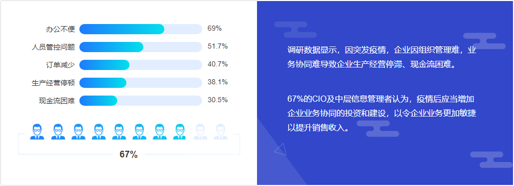 而另一方面,在協同辦公上也暴露出了很多問題,比如企業本身對遠程辦公,協同調度等不重視,IT軟硬件投入不足,多工具多系統并存卻無法融合,不能統一管理等。業務需實現在線化、基礎設施需快速云化,提升企業協同辦公效率是擺在企業進行數字化轉型面前的一大難題,盡管市面有很多協同辦公工具供企業選擇,但在數字化轉型的需求下,企業需要的不僅僅解決單一問題的工具。如要達成通過數字化轉型實現降本增效,企業需要的是一整套易用性高、兼容性強、可移動并貼合企業自身使用需求的協同辦公解決方案。