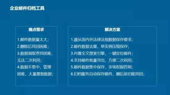 每個人的郵箱中都有成千上百條重要的信息往來,萬一丟失、誤刪某一條信息想要找回就變得非常困難,因此需要一種找到所需信息的簡單方法。我們的本地歸檔產品遵從國內外法律法規數據保存要求,可作為企業郵件歸檔和數據備份工具,內置全文搜索引擎,一鍵定位郵件。支持備份全域郵件,可隨時恢復、還原和遷移。