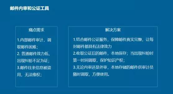 電子郵件的審計和公證對于中小企業來說需求并不強烈,但對于大型國企客戶、行業領軍名企、政府機關、事業單位等來說卻是剛需。尤其在涉密單位,往往因為內部某些人員的疏漏而導致商業糾紛、泄露私密材料等嚴重的信息安全問題。然而電子郵件很容易被篡改和刪除,很難直接作為司法證據。企業郵箱本地歸檔產品對出入域郵件進行全面監控,并且與國內權威公證機構合作,可直接進行公證,讓每封郵件都具有法律效力,幫助企業客戶保護知識產權,規避風險。