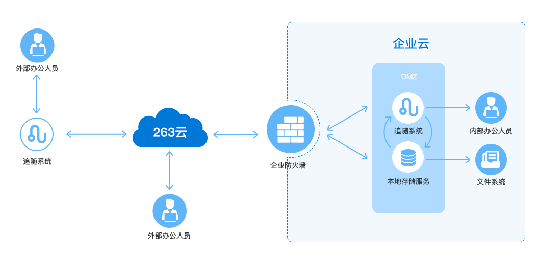 ? 外網用戶連接到263云端進行收發 ? 內網用戶連接到內網追隨進行收發,域內郵件不出公網,直接保存到本地存儲 ? 域名MX DNS指向263到MX ? 內網POP/IMAP/SMTP DNS指向追隨系統 ? 外網POP/IMAP/SMTP DNS指向263云